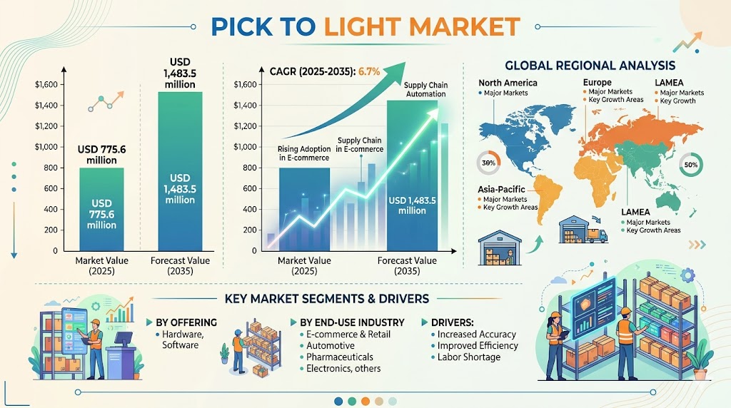 NEWARK, DE, UNITED STATES, March 30, 2026 /EINPresswire.com/ -- The global Pick to Light Market is witnessing strong, data-driven expansion, supported by rapid e-commerce growth and increasing demand for high-precision order fulfillment systems. The market is valued at USD 775.6 million in 2025 and is projected to reach USD 1,483.5 million by 2035, registering a CAGR of 6.7% over the forecast period. This represents an absolute growth of USD 707.9 million, highlighting the critical role of visual-guided picking technologies in modern logistics.